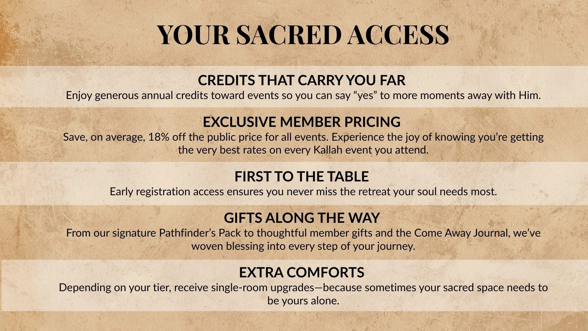This isn’t just a program—it’s your open door to deeper encounters, richer experiences, and more intentional space with God. It’s your ongoing invitation to step out of the noise and walk in a rhythm of renewal all year long.